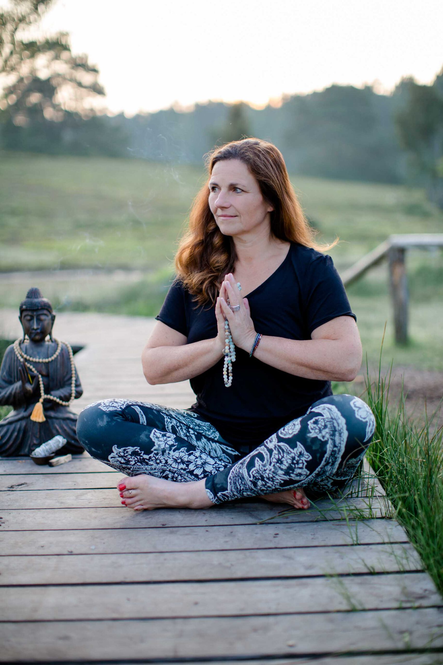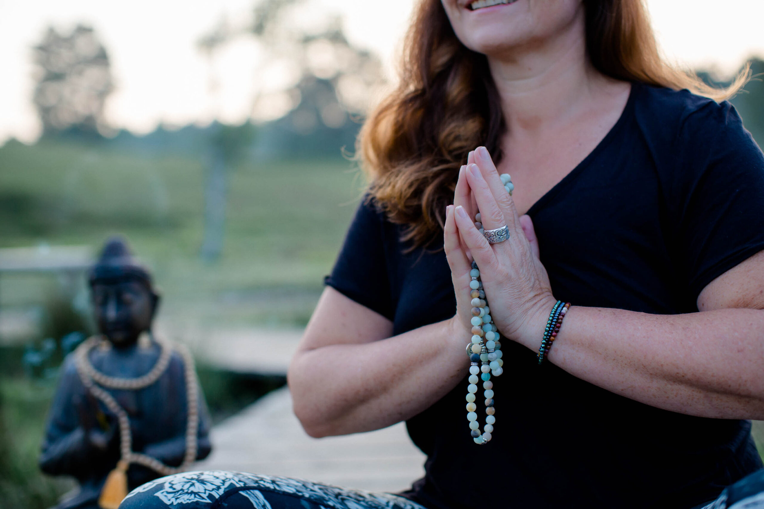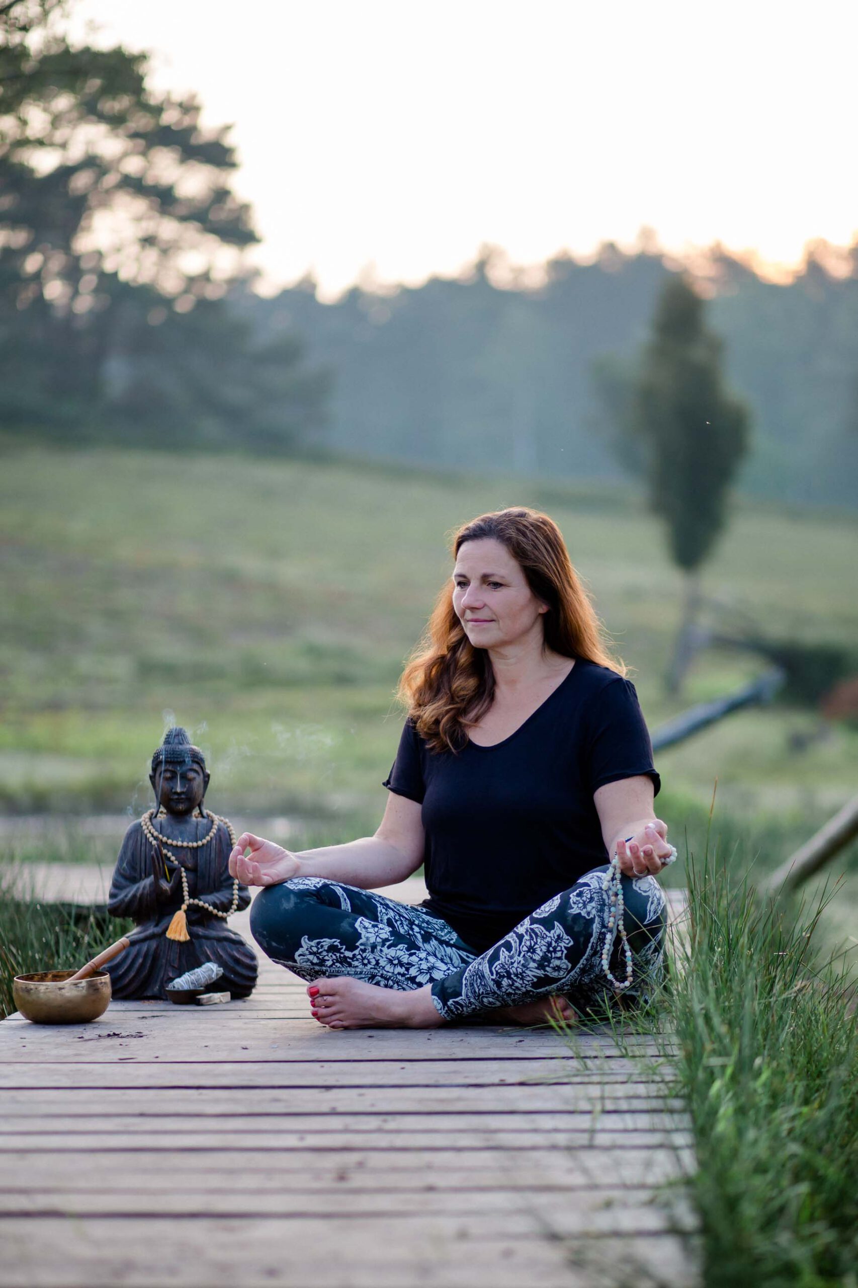 Businessfotos Yoga: Yogalehrerin sitzt meditierend im Schneidersitz auf einem Holzsteg in der Natur, ruhige Abendstimmung mit Buddhafigur im Vordergrund