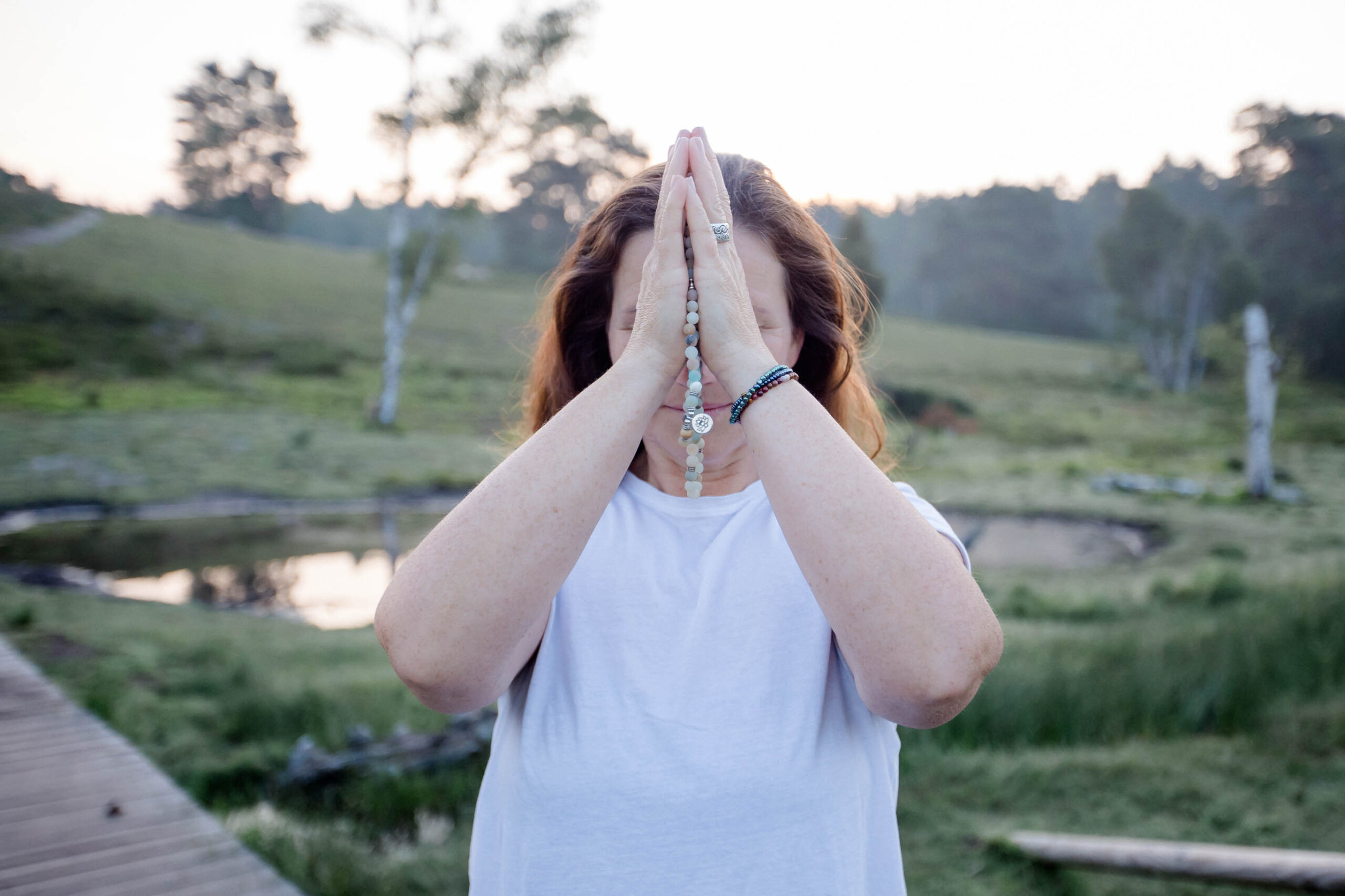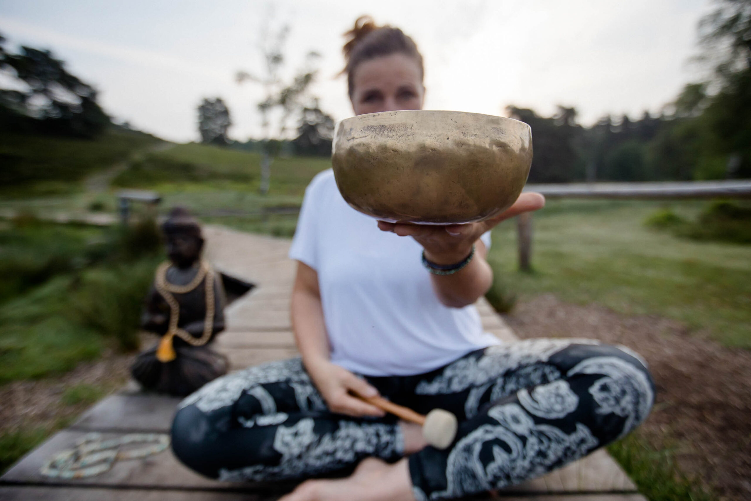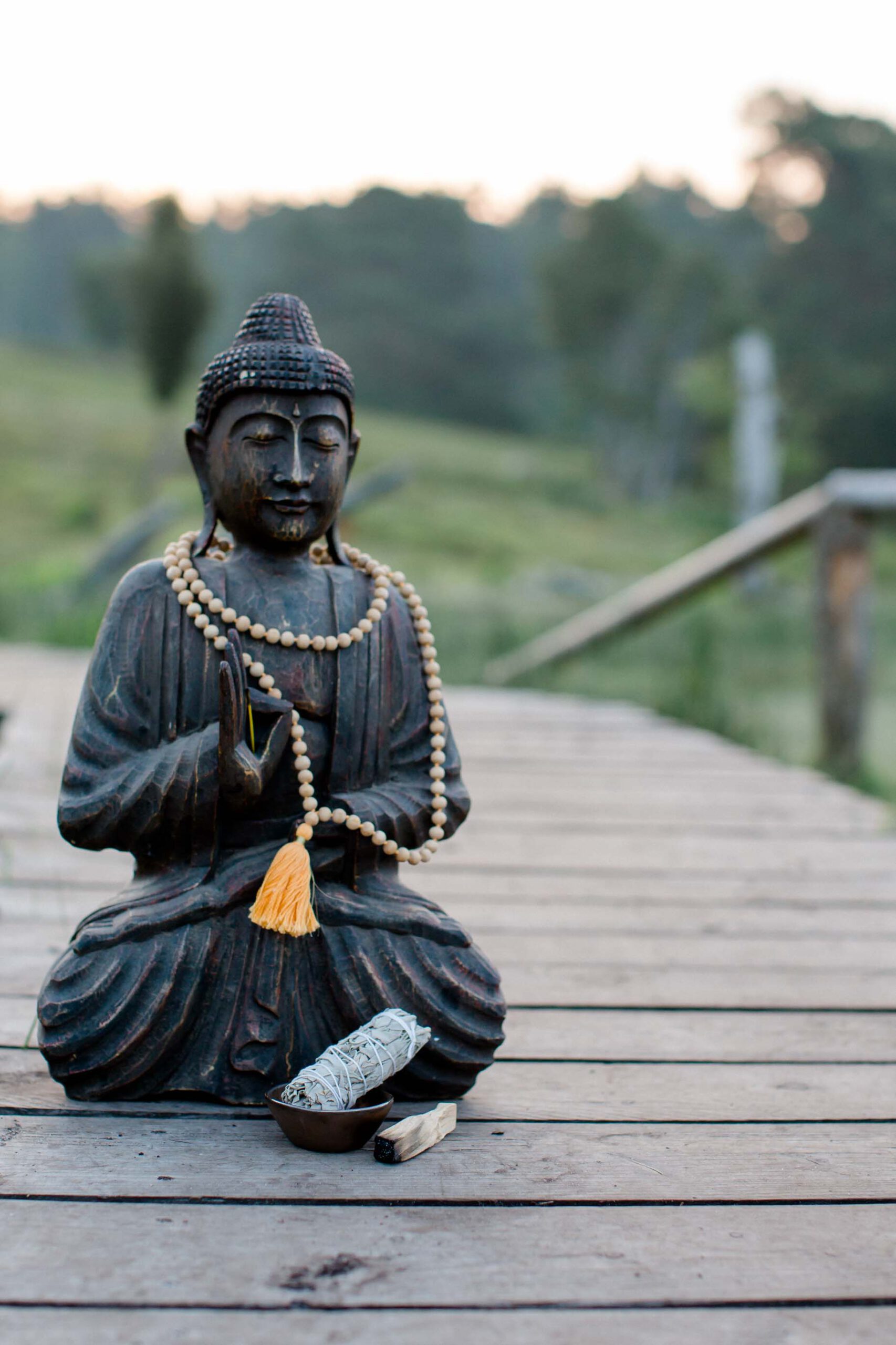 Businessfotos Yoga: Yogalehrerin sitzt meditierend im Schneidersitz auf einem Holzsteg in der Natur, ruhige Abendstimmung mit Buddhafigur im Vordergrund