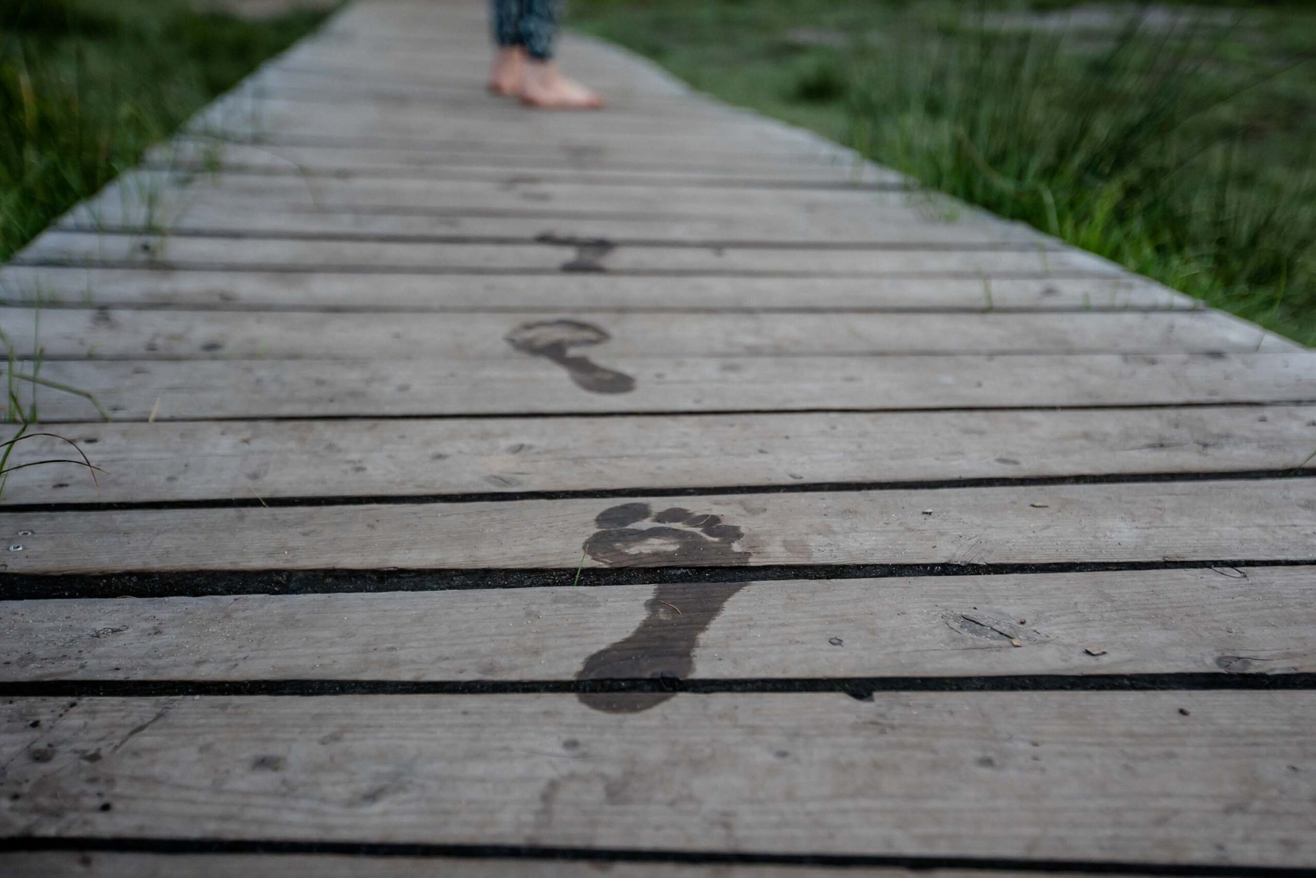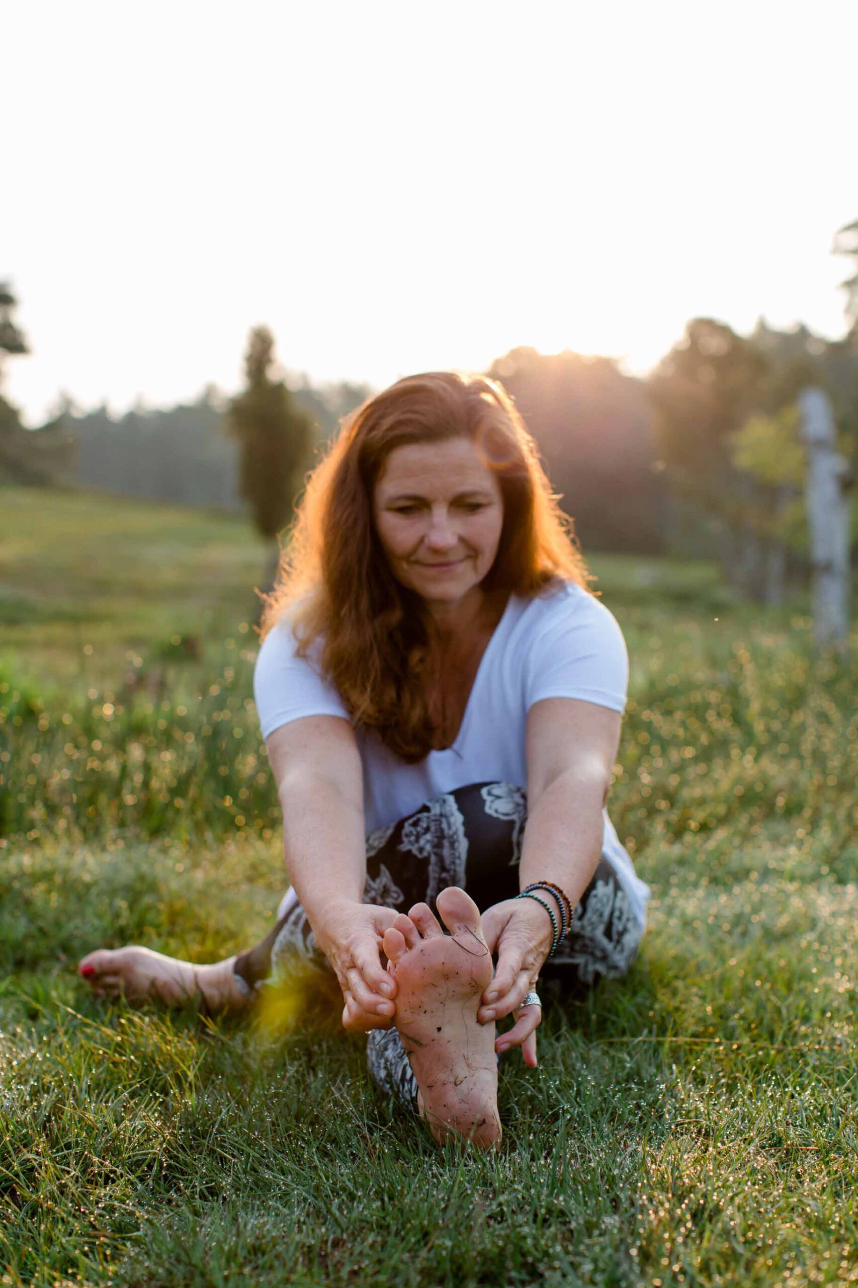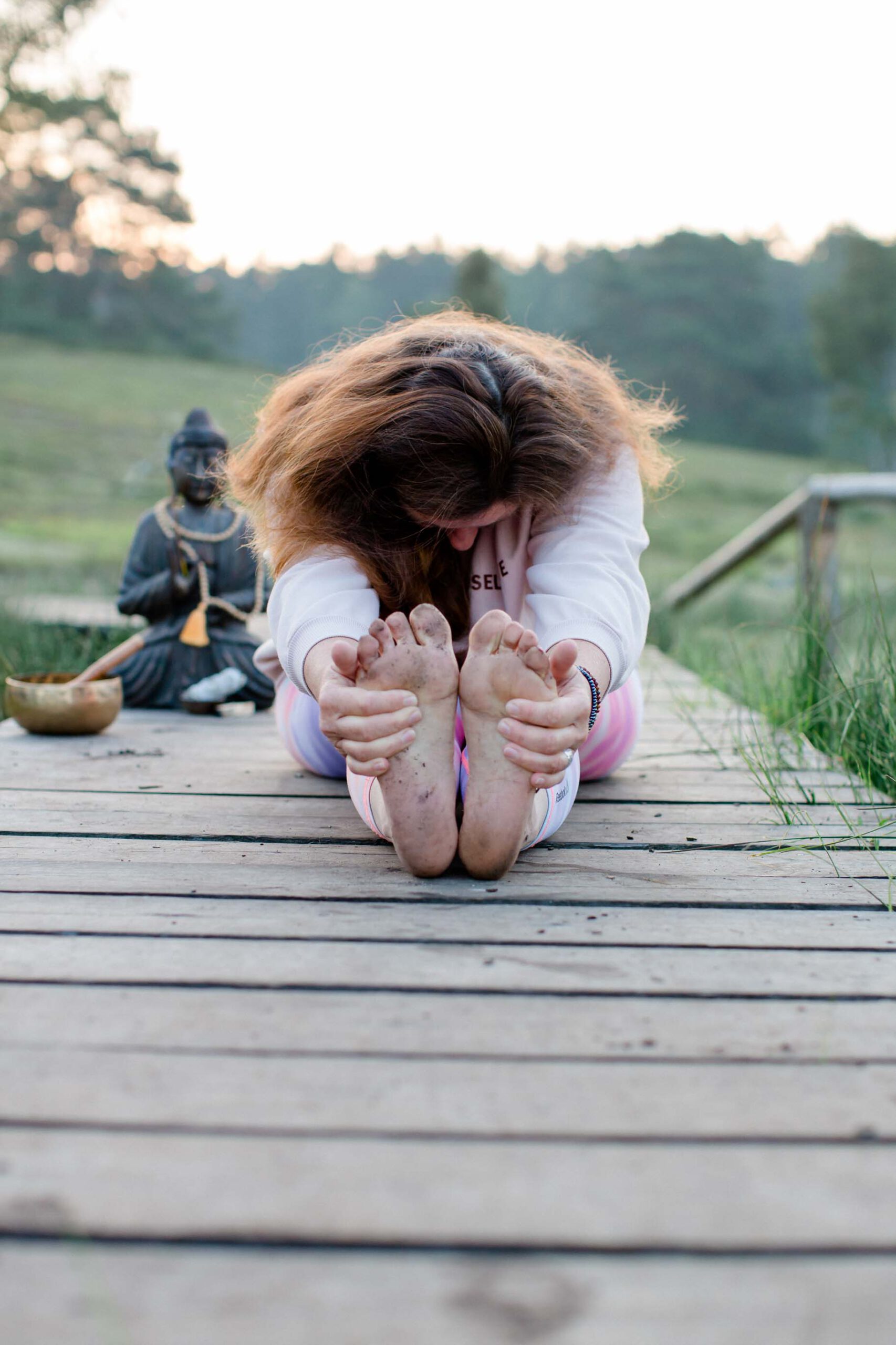 Businessfotos Yoga: Detailaufnahme von schmutzigen Füßen beim Yoga auf einem Holzsteg in der Natur – natürlich und ungezwungen