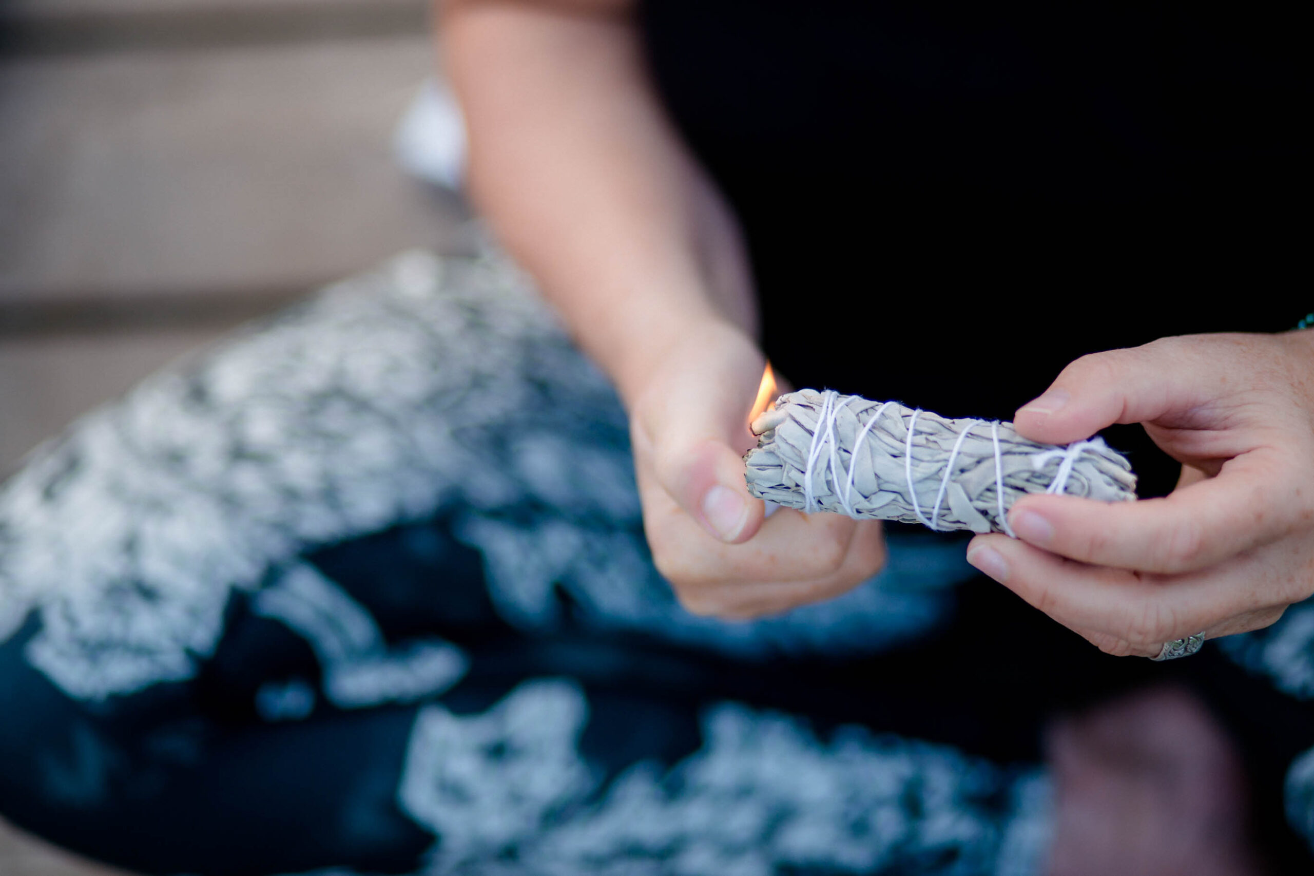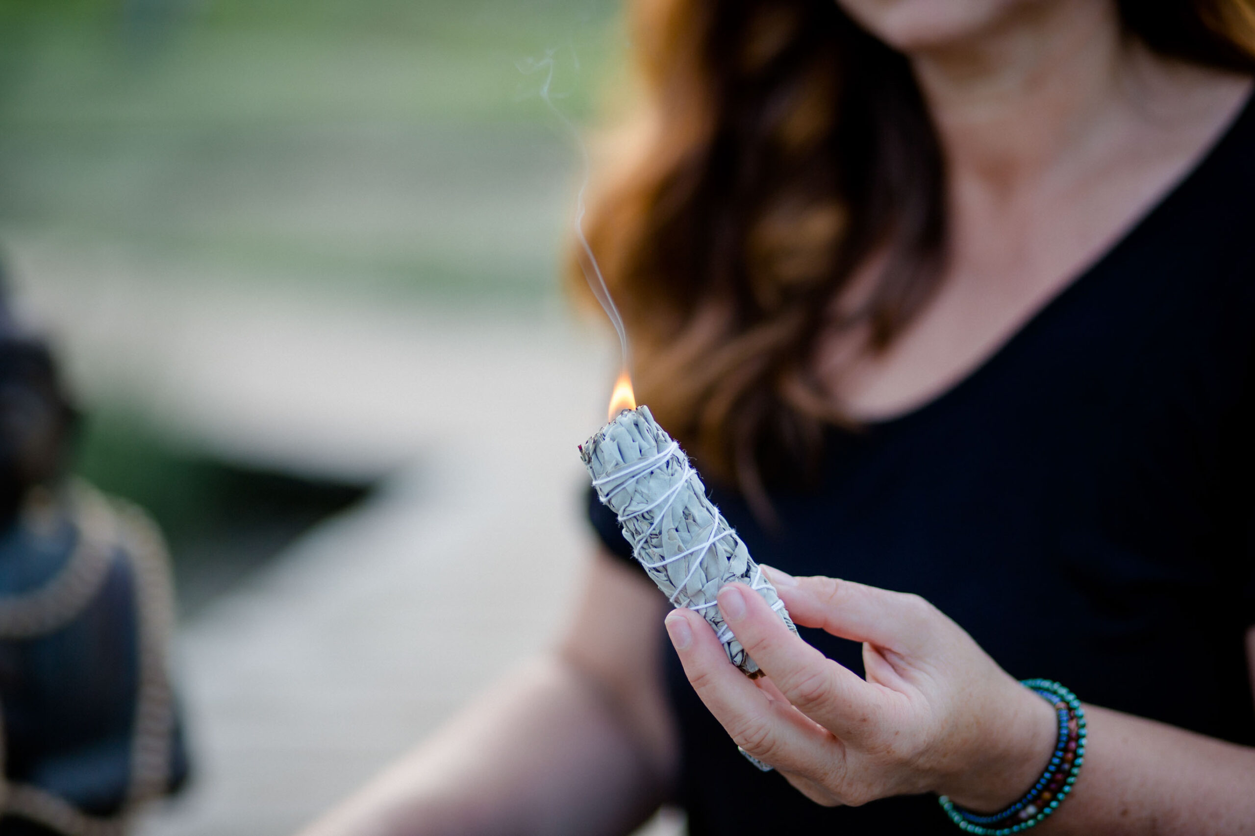 Businessfotos Yoga: Detailaufnahme von brennendem Räucherbündel in der Hand, ruhige Stimmung und weiches Licht im Hintergrund