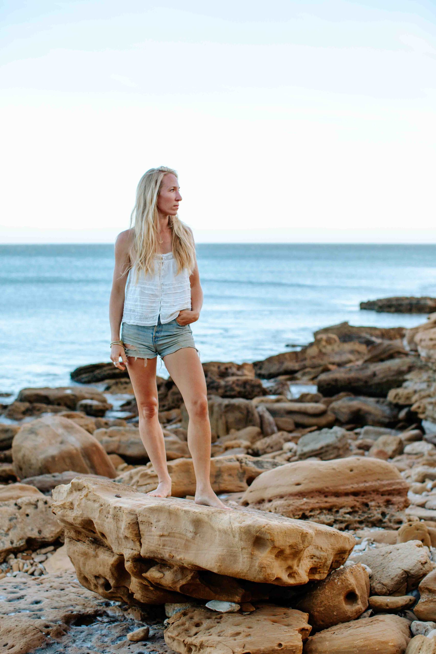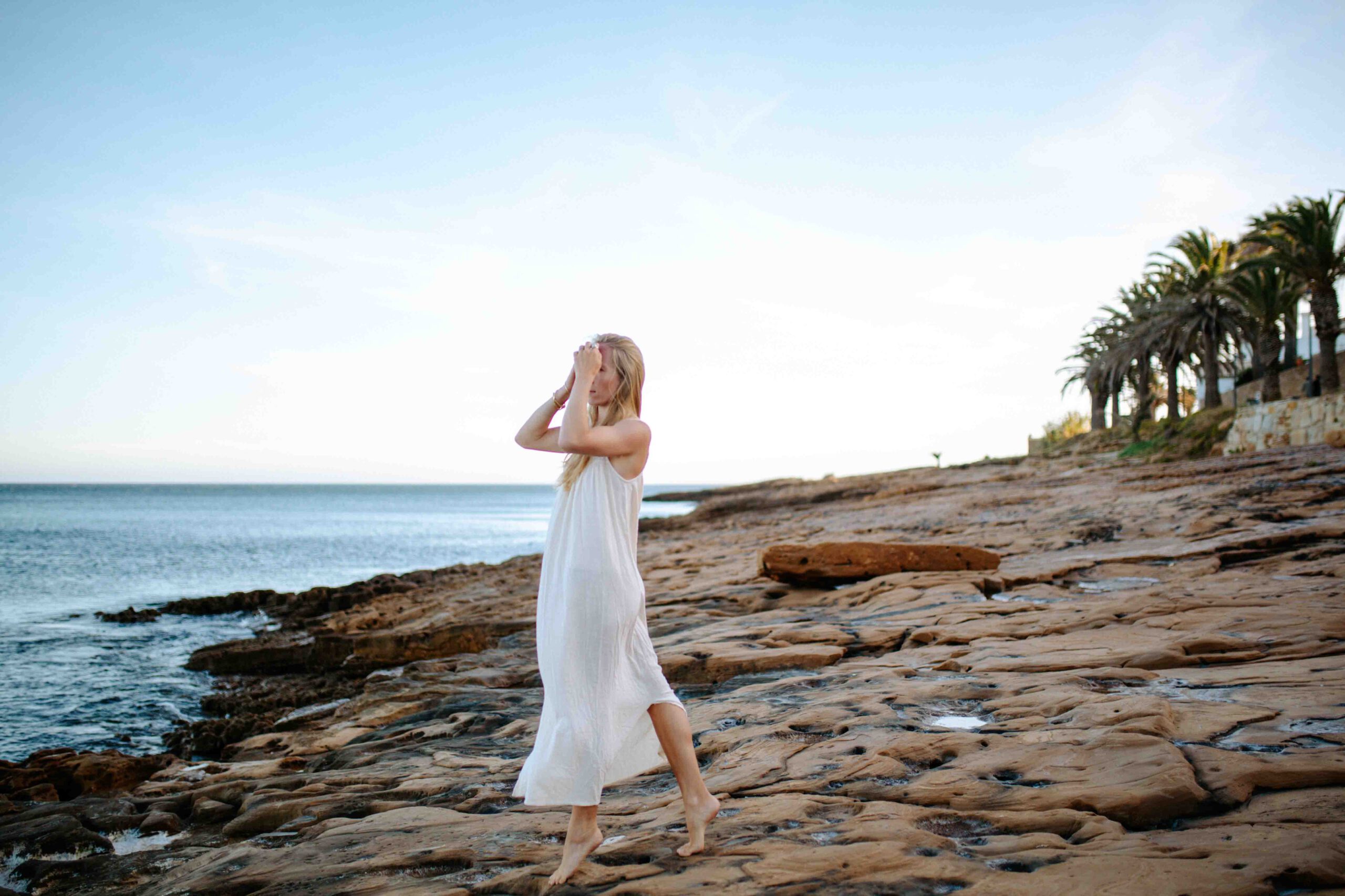 Frau im weißen Kleid am Steinstrand