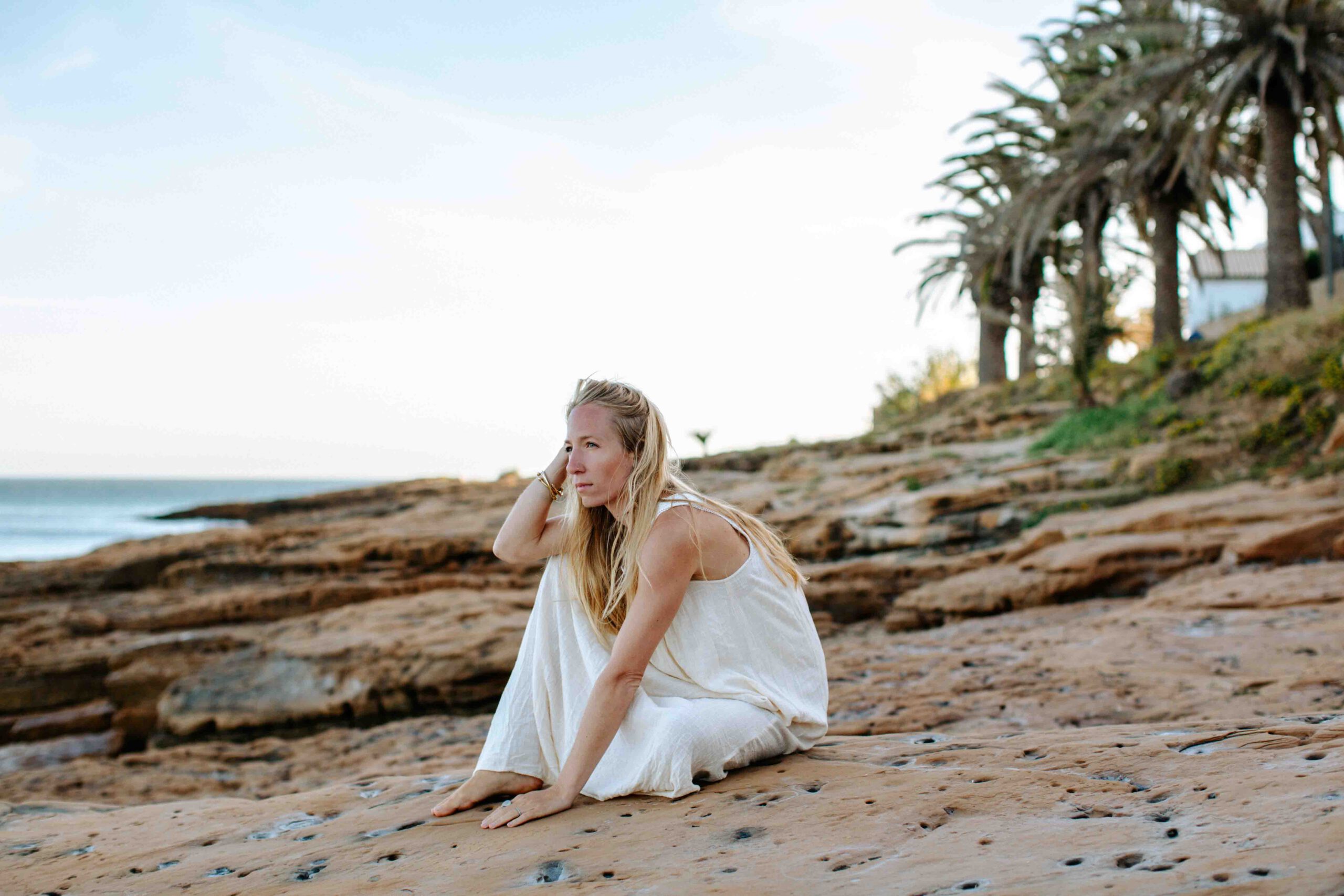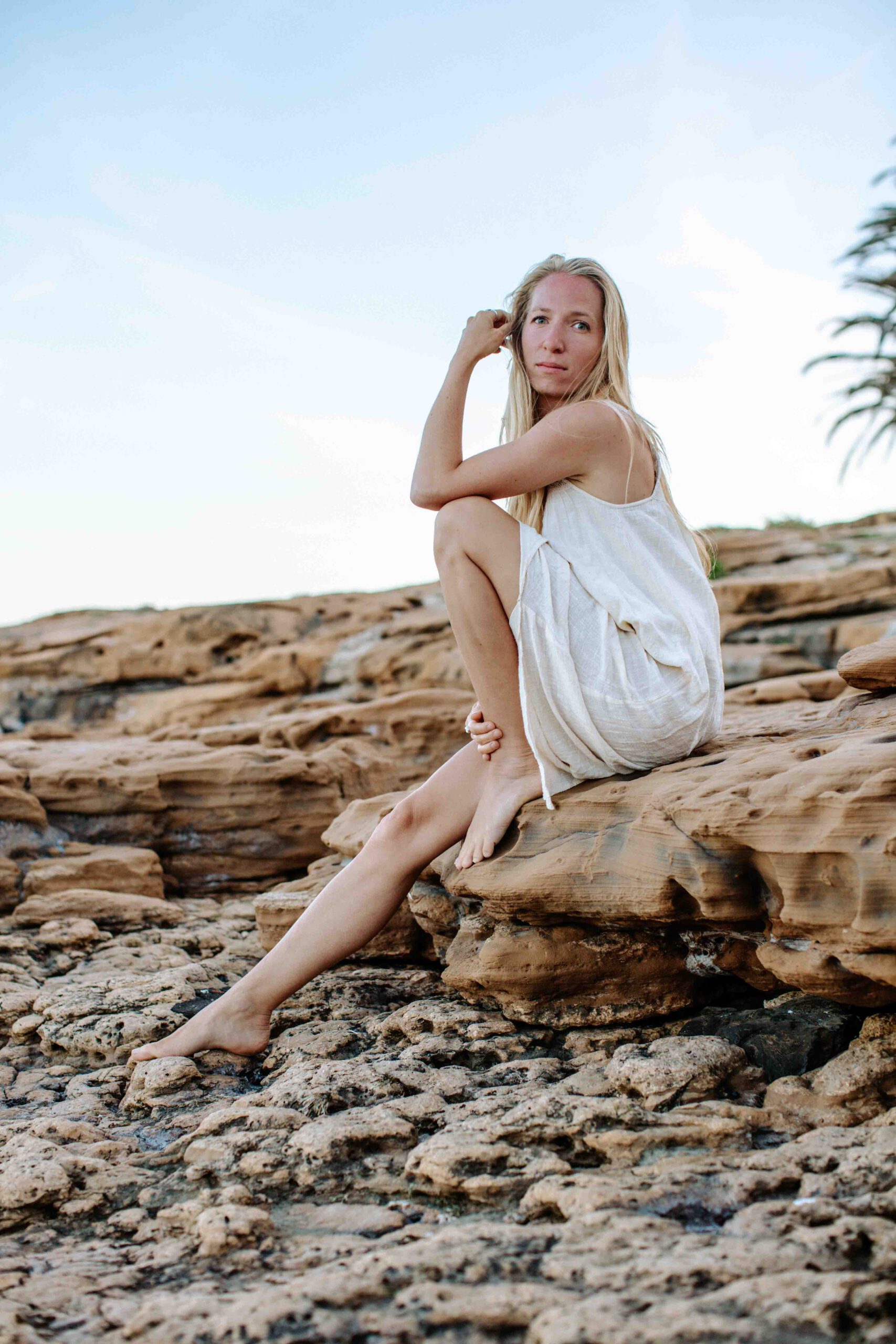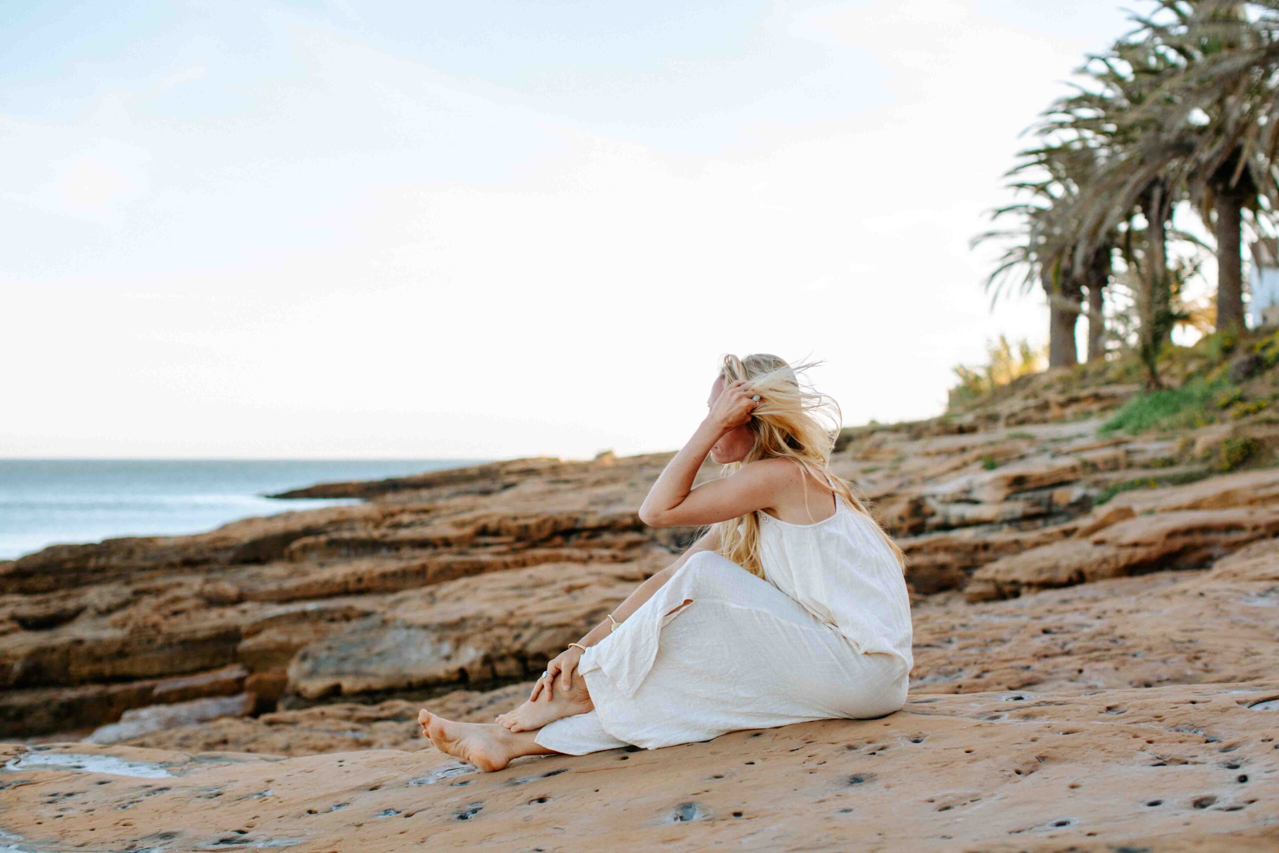 Frau im weißen Kleid sitzt auf Stein am Steinstrand