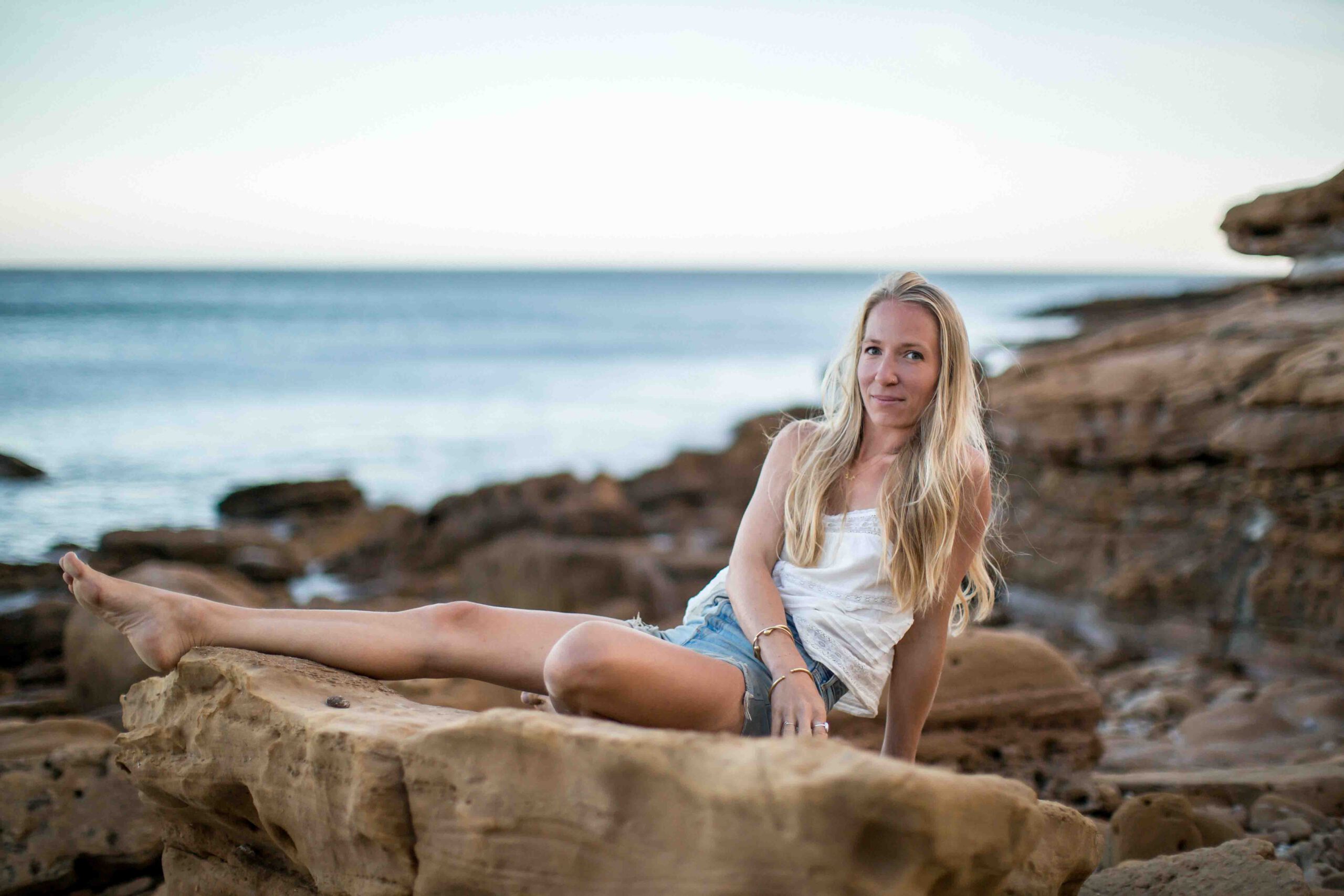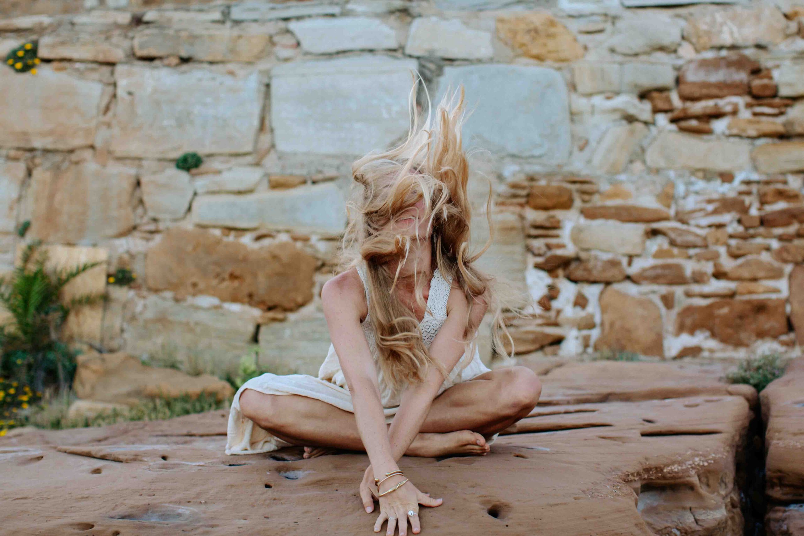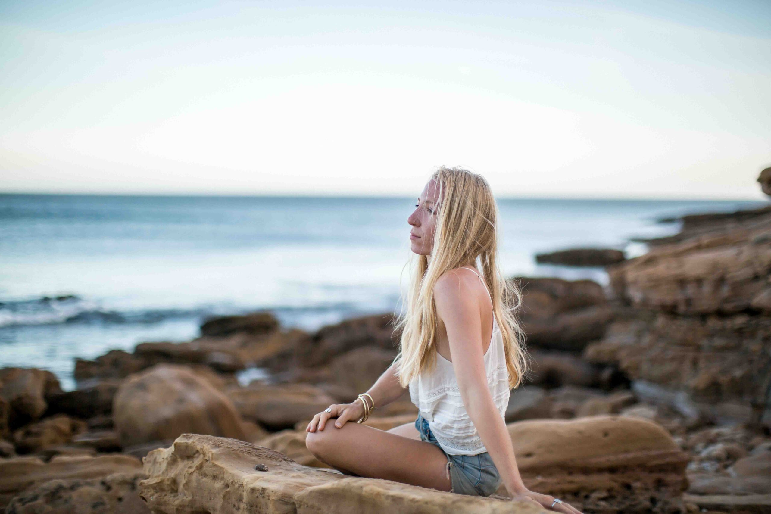 Frau im weißen Kleid sitzt auf Stein am Steinstrand